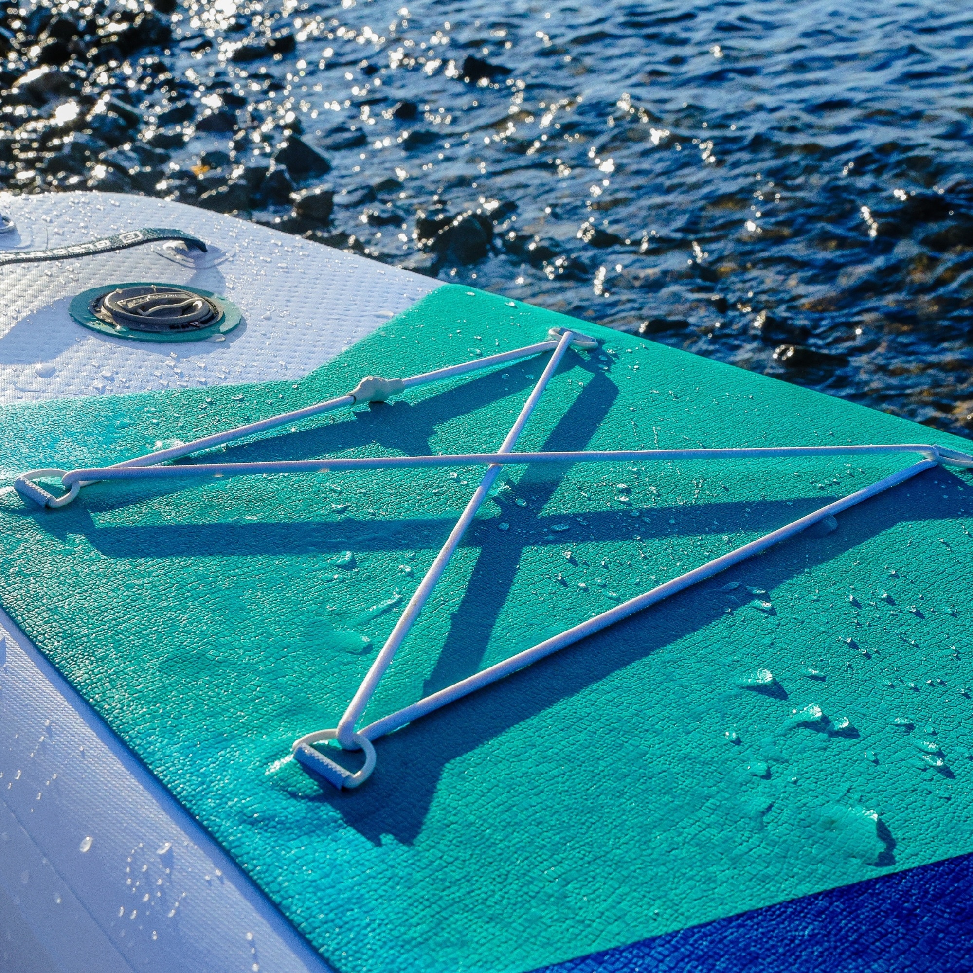 The set is complete and includes a transport backpack, a 3-piece composite paddle (fibreglass shaft with a durable plastic blade), a manual pump, a removable US-BOX fin (screw included in the repair kit), a leash and a repair kit with patches, fin screws and a valve wrench. Inflate it and you are ready to get on the water.