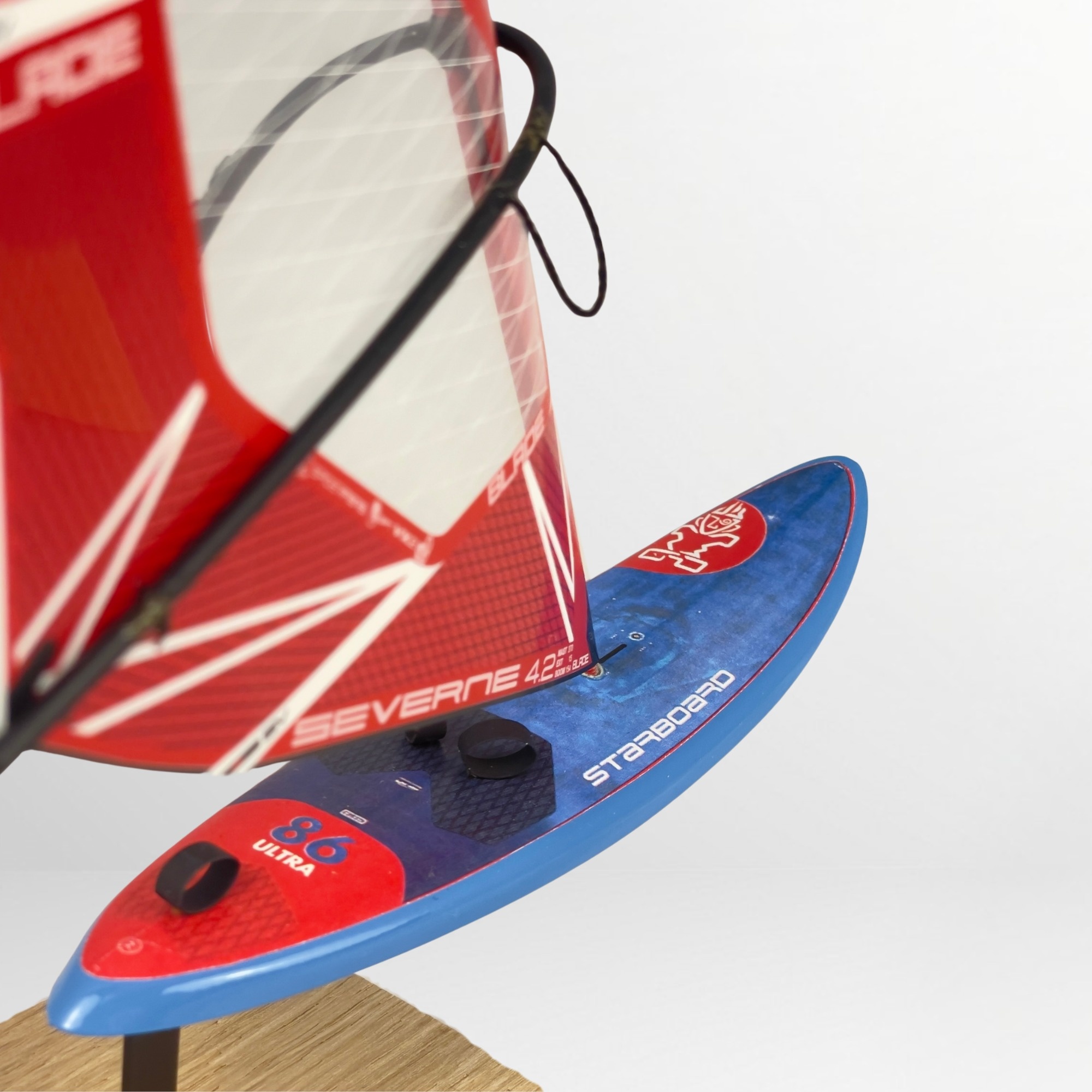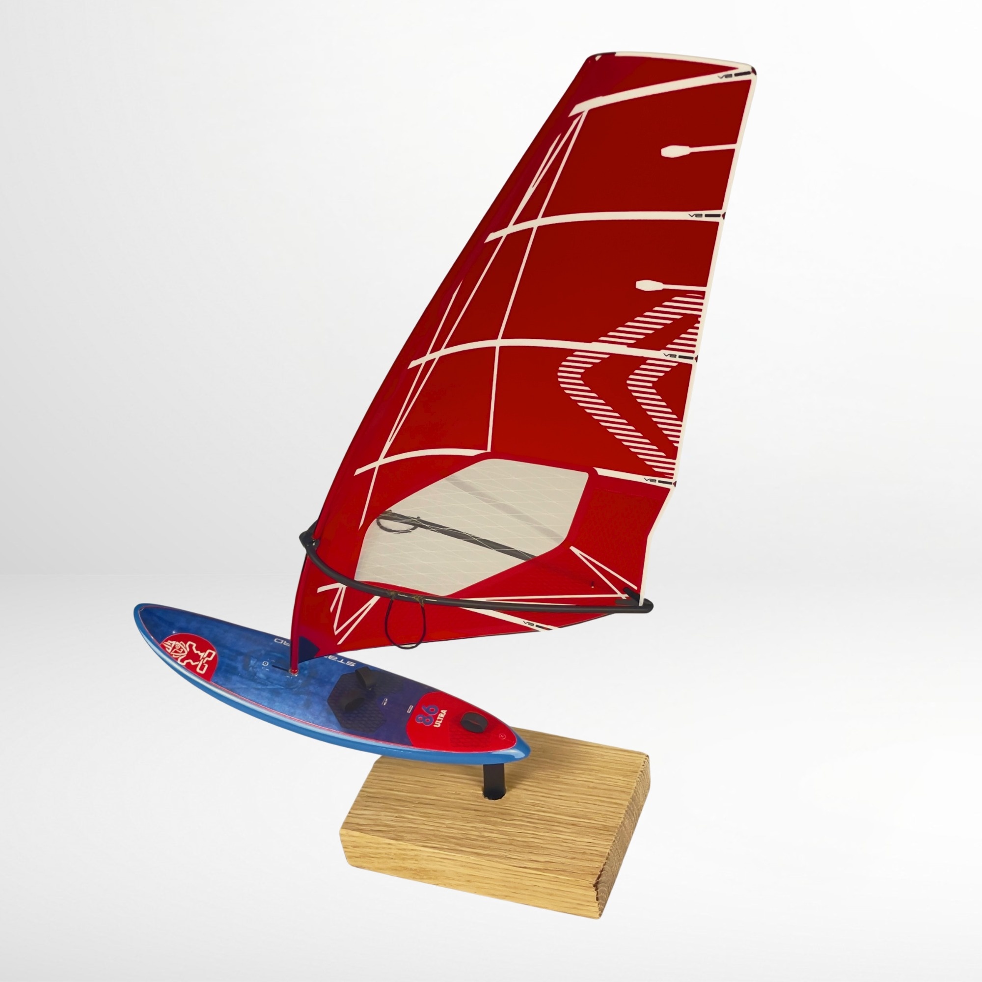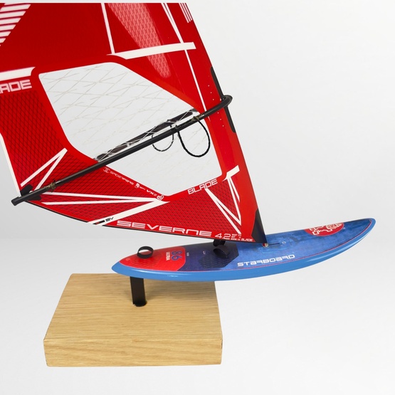 The decorative windsurfing model Starboard Ultra Carbon Board + Severne Blade Red Sail is a realistic miniature of a legendary windsurfing setup in 1:16 scale. It’s a perfect gift for a windsurfing enthusiast or an elegant decoration for the office or living room. Each collectible board model is crafted with great attention to detail – from the monofilm sail to the wooden stand.