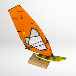 Collectible windsurfing board model realistically convey the original sails and boards in scale 1:16. The sails are produced with the same monofilm screen used in the real sails, with attension to little details like uphaul or harness lines. The boards are positioned on a stylish oak wood stand, easily displaying the models on a flat surface.
