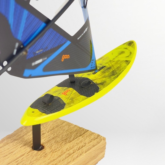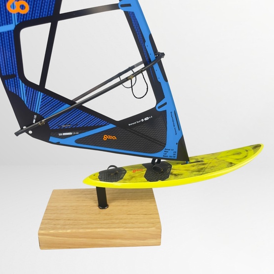 Collectible windsurfing board model realistically convey the original sails and boards in scale 1:16. The sails are produced with the same monofilm screen used in the real sails, with attension to little details like uphaul or harness lines. The boards are positioned on a stylish oak wood stand, easily displaying the models on a flat surface.