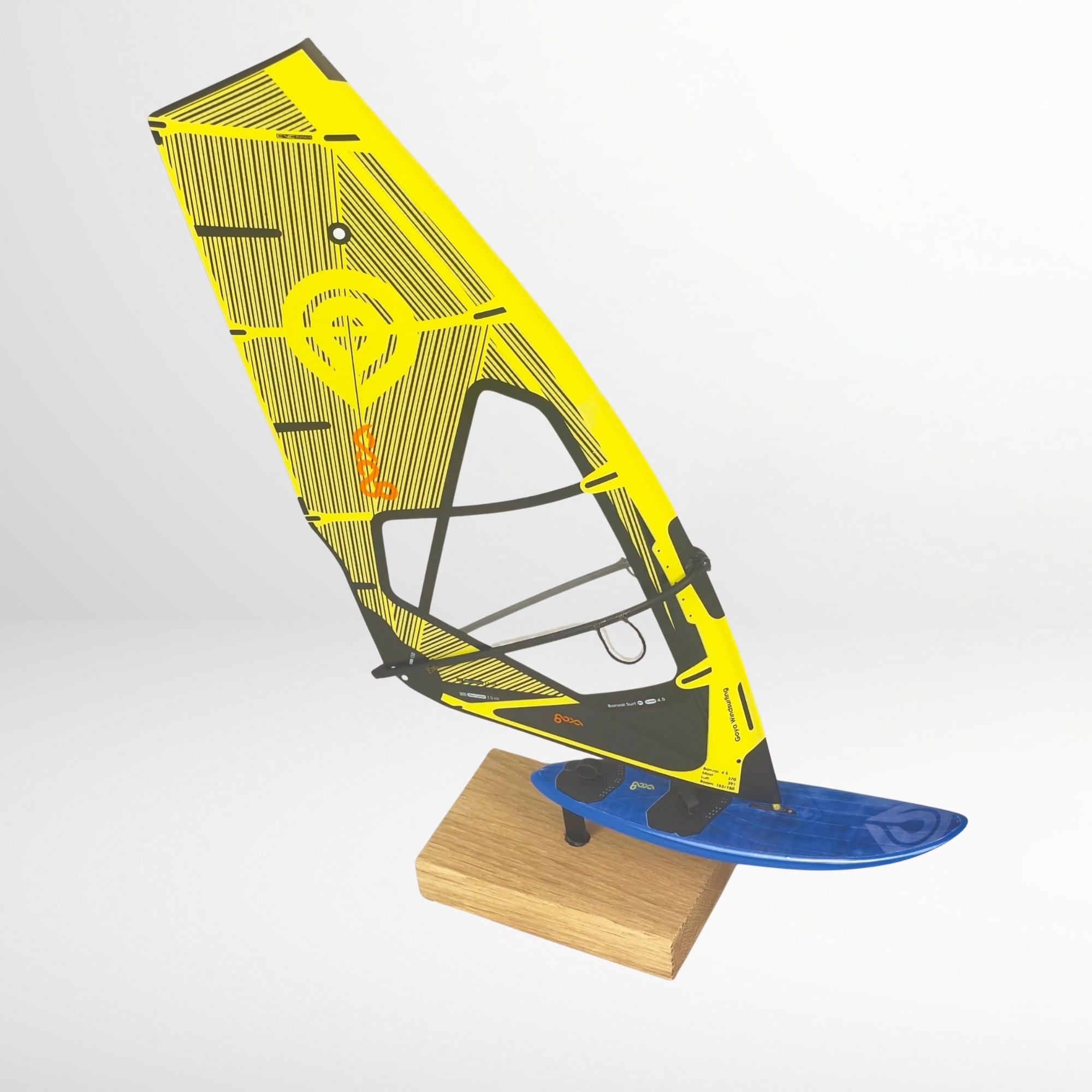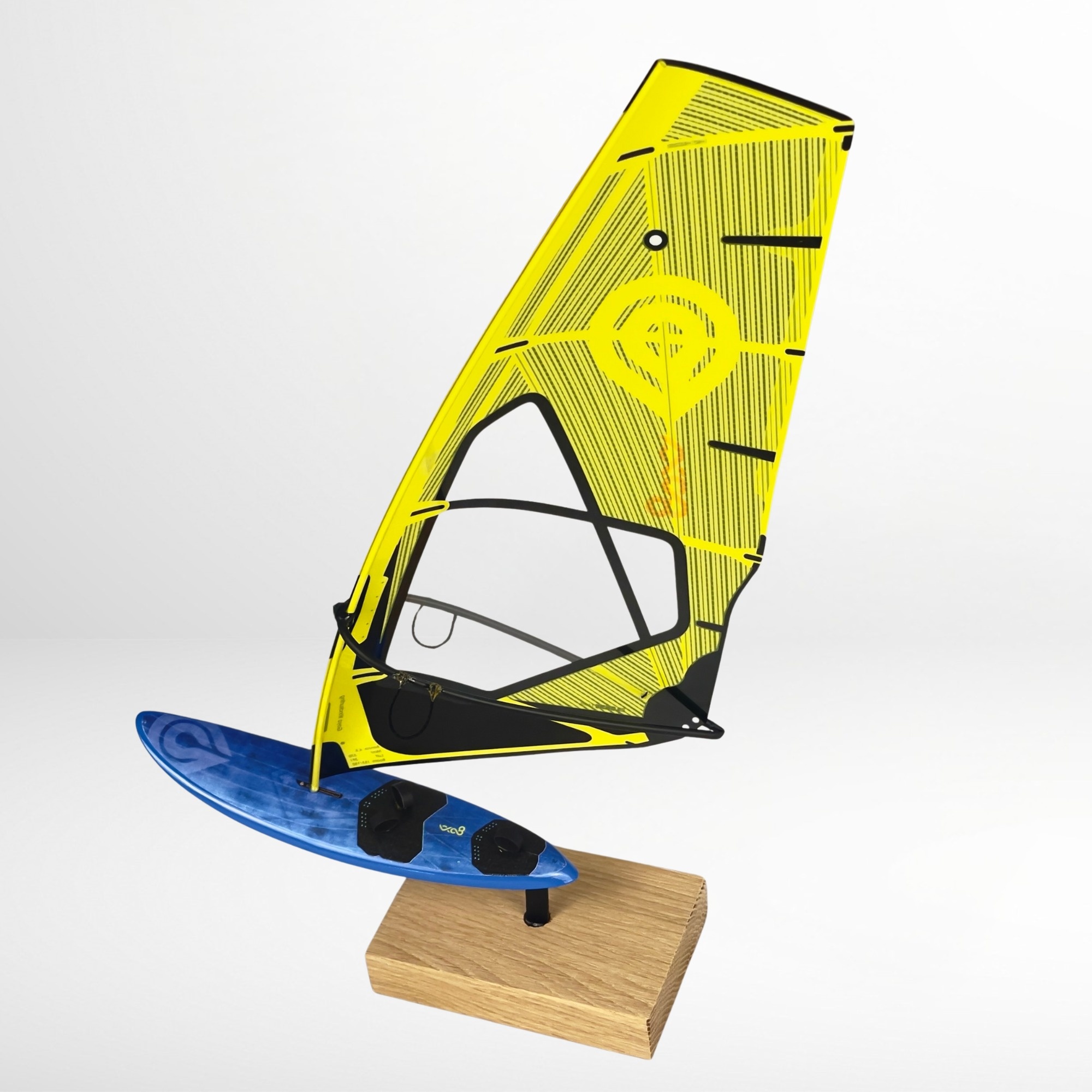 The decorative windsurfing model Goya Blue Board + Goya Yellow Sail is a realistic miniature of a legendary windsurfing setup in 1:16 scale. It’s a perfect gift for a windsurfing enthusiast or an elegant decoration for the office or living room. Each collectible board model is crafted with great attention to detail – from the monofilm sail to the wooden stand.