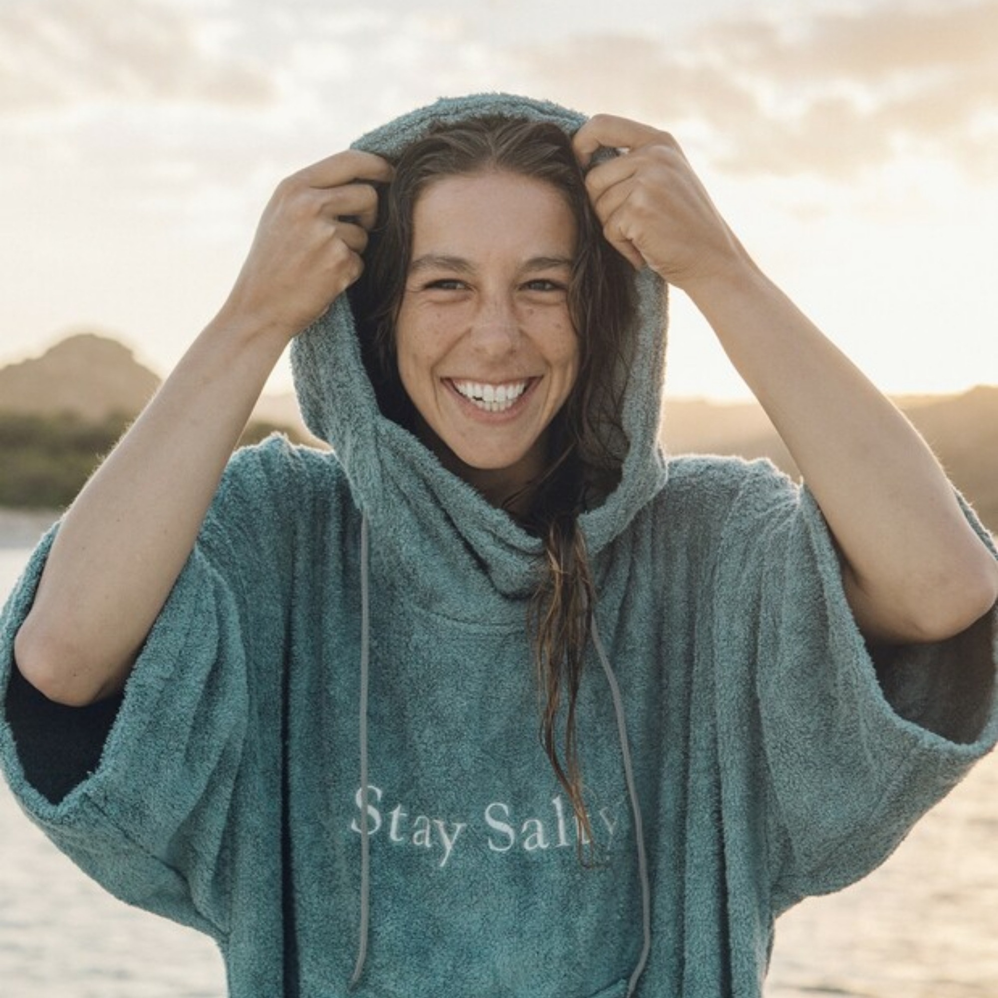 The poncho is made from bamboo fabric, which feels noticeably softer than standard cotton. It absorbs water three to four times better and dries much faster, making it practical for frequent sessions and cold-weather use.