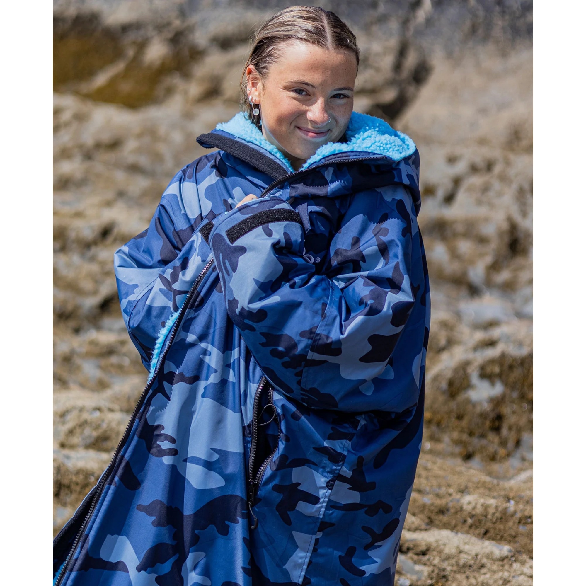 The inside is fully lined with fleece, including the hood. The fabric helps move moisture away from the skin and supports warmth and recovery after swimming, surfing or other watersports. It gives you a more comfortable way to change outdoors without rushing through the process in the cold.