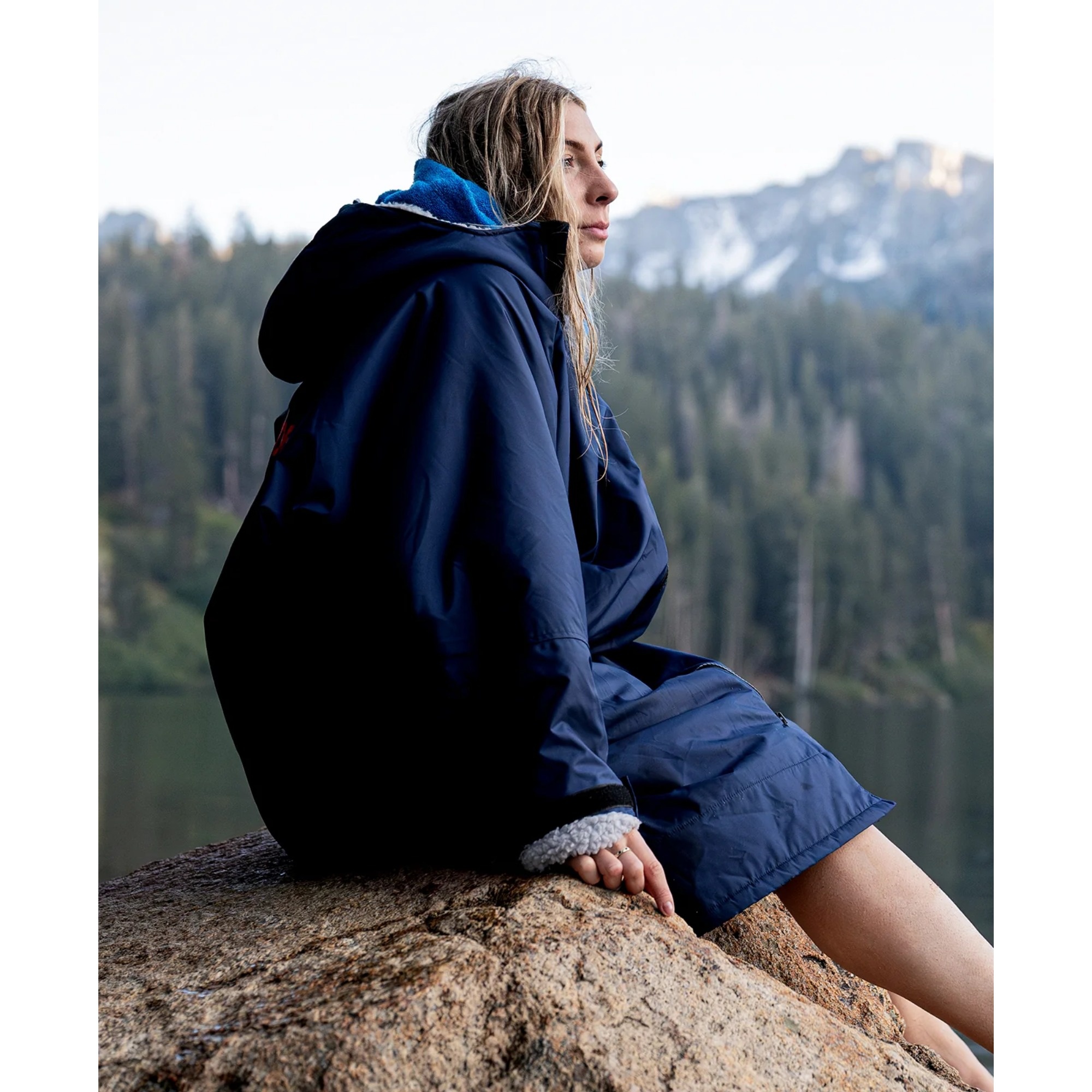 The inside is fully lined with fleece, including the hood. The fabric helps move moisture away from the skin and supports warmth and recovery after swimming, surfing or other watersports. It gives you a more comfortable way to change outdoors without rushing through the process in the cold.