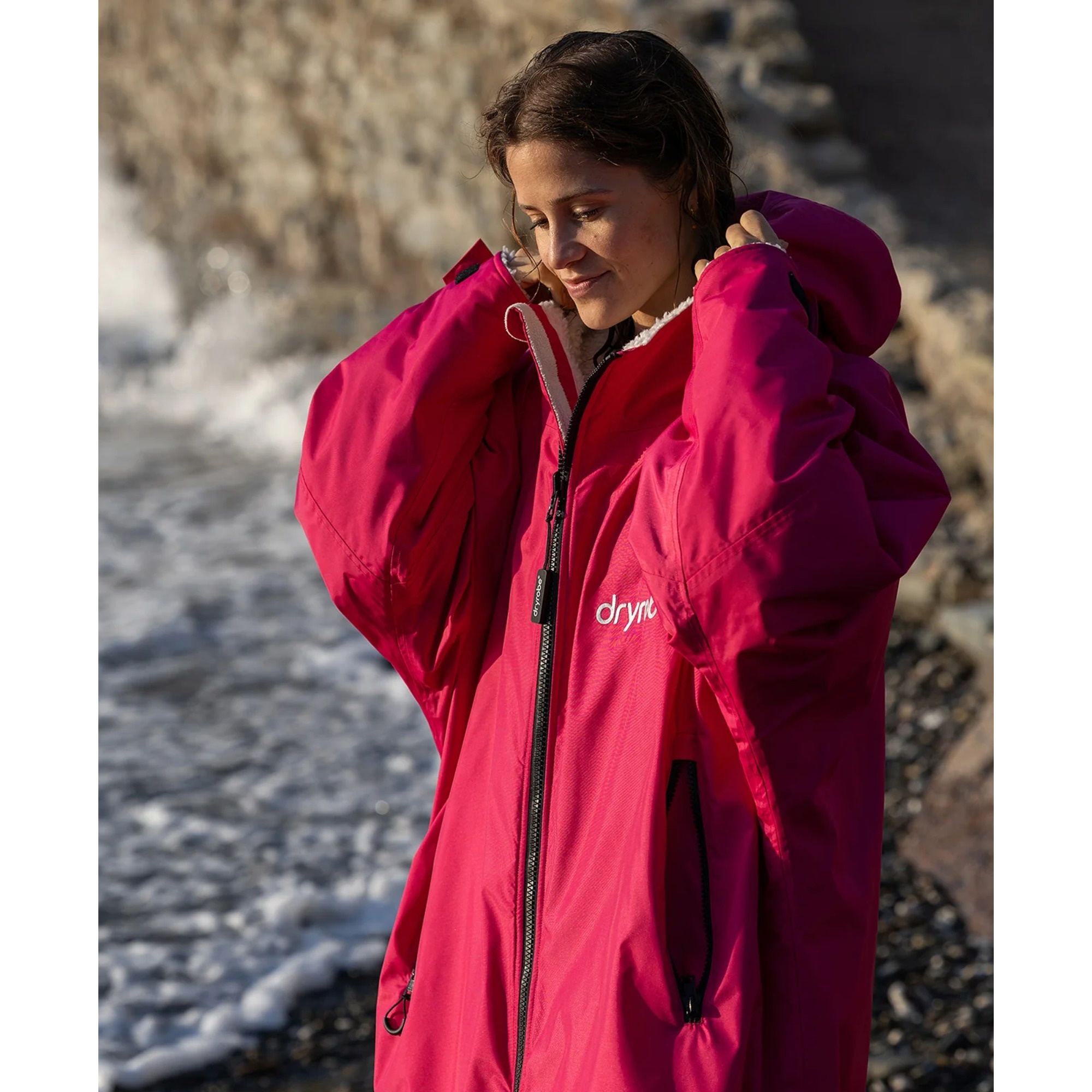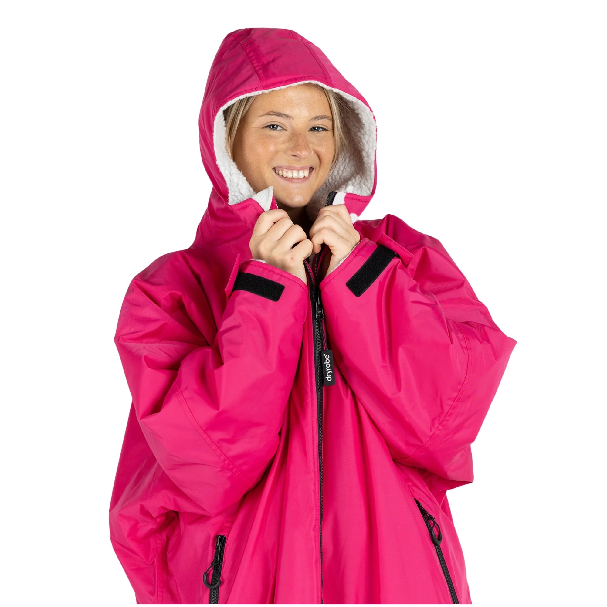The inside is fully lined with fleece, including the hood. The fabric helps move moisture away from the skin and supports warmth and recovery after swimming, surfing or other watersports. It gives you a more comfortable way to change outdoors without rushing through the process in the cold.
