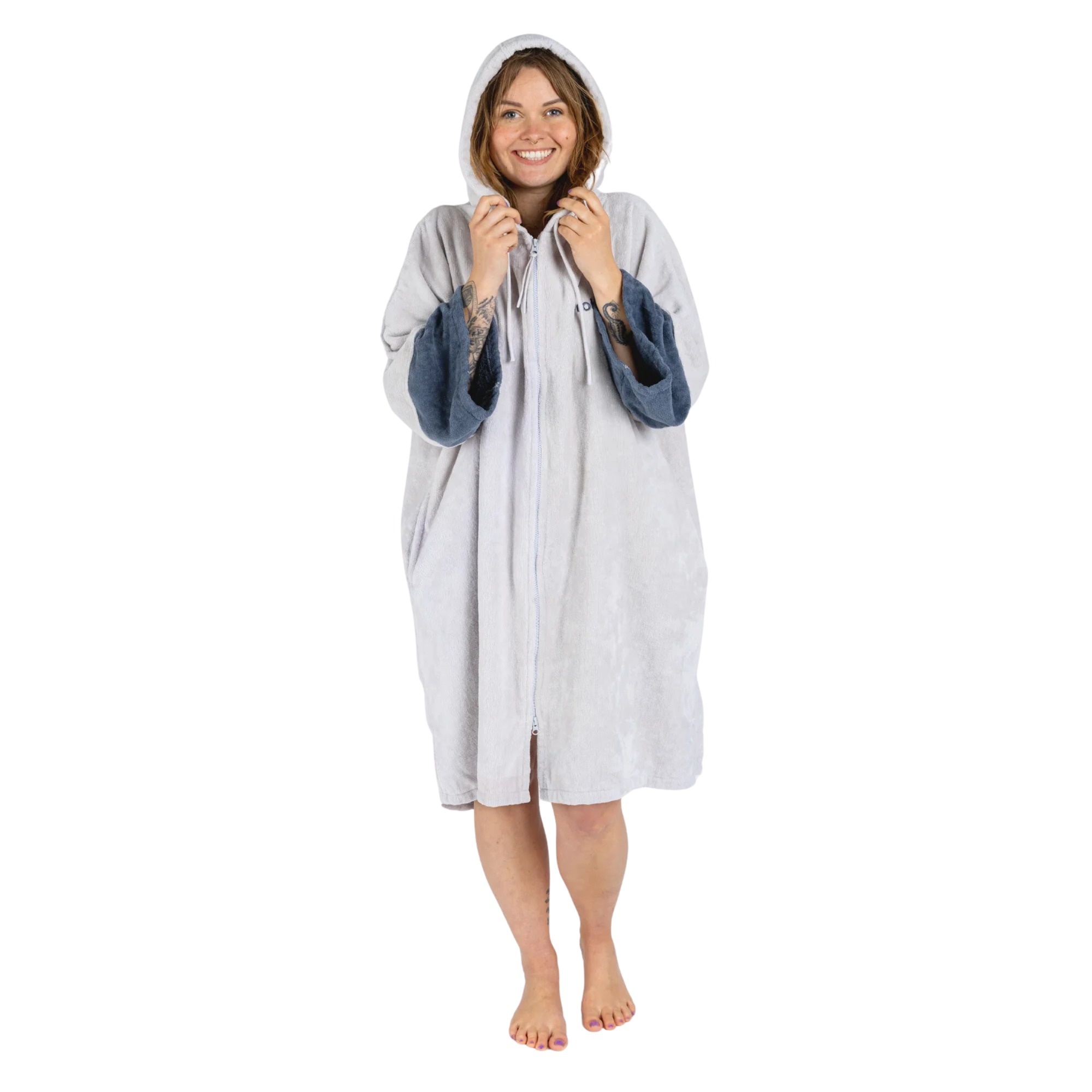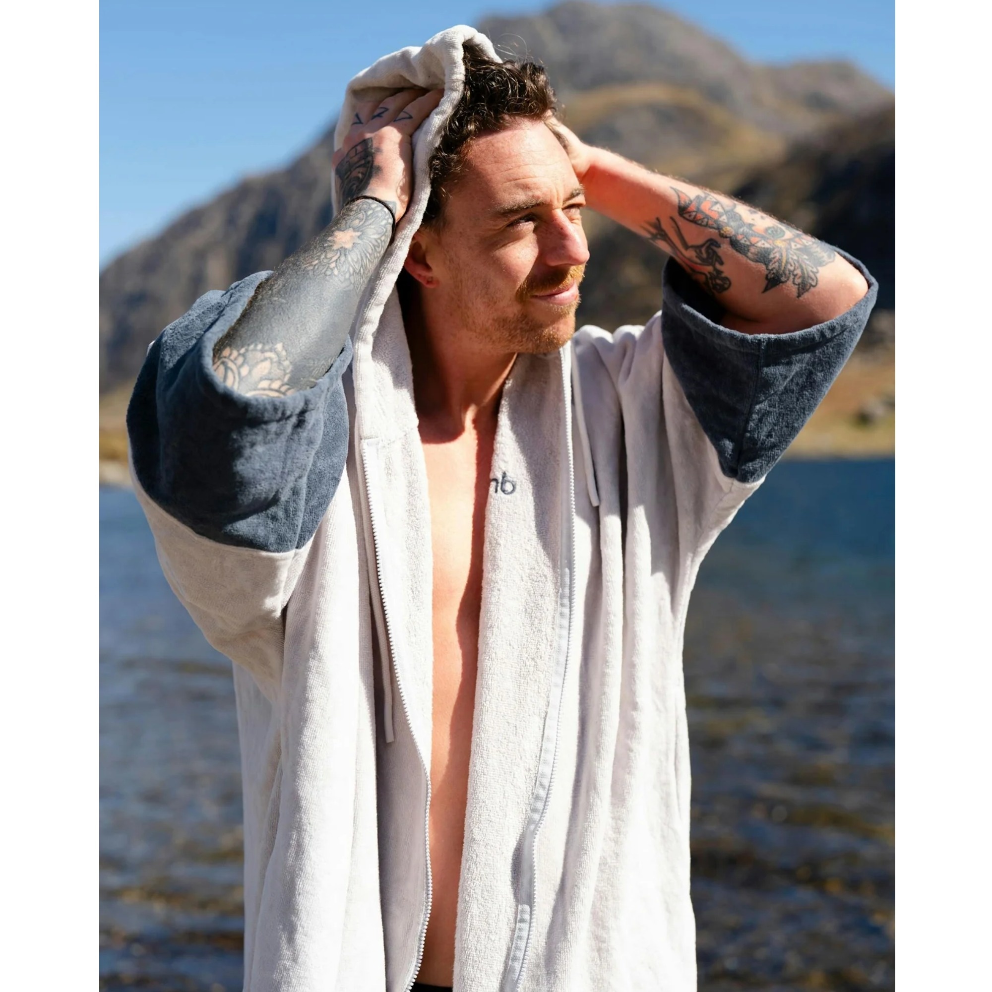 This model is made from 100% organic cotton certified to GOTS. The velour fabric is soft, comfortable against the skin and highly absorbent, making it a practical layer after time in the water. It is a strong option for users who do not need a waterproof outer shell, but want something light, comfortable and effective for drying off and changing.