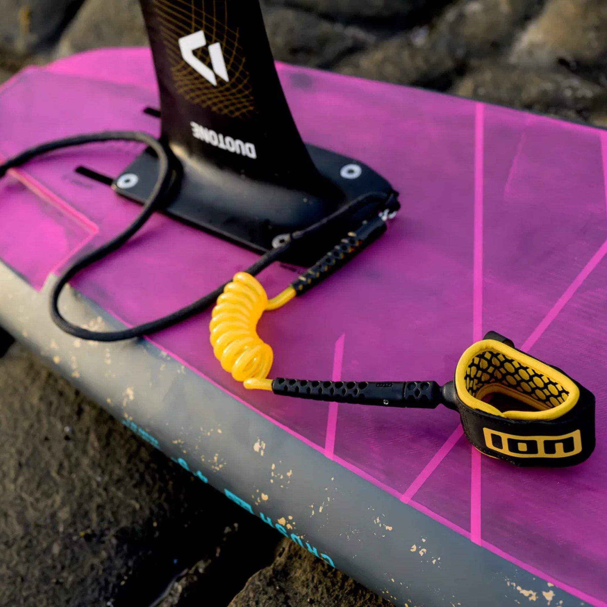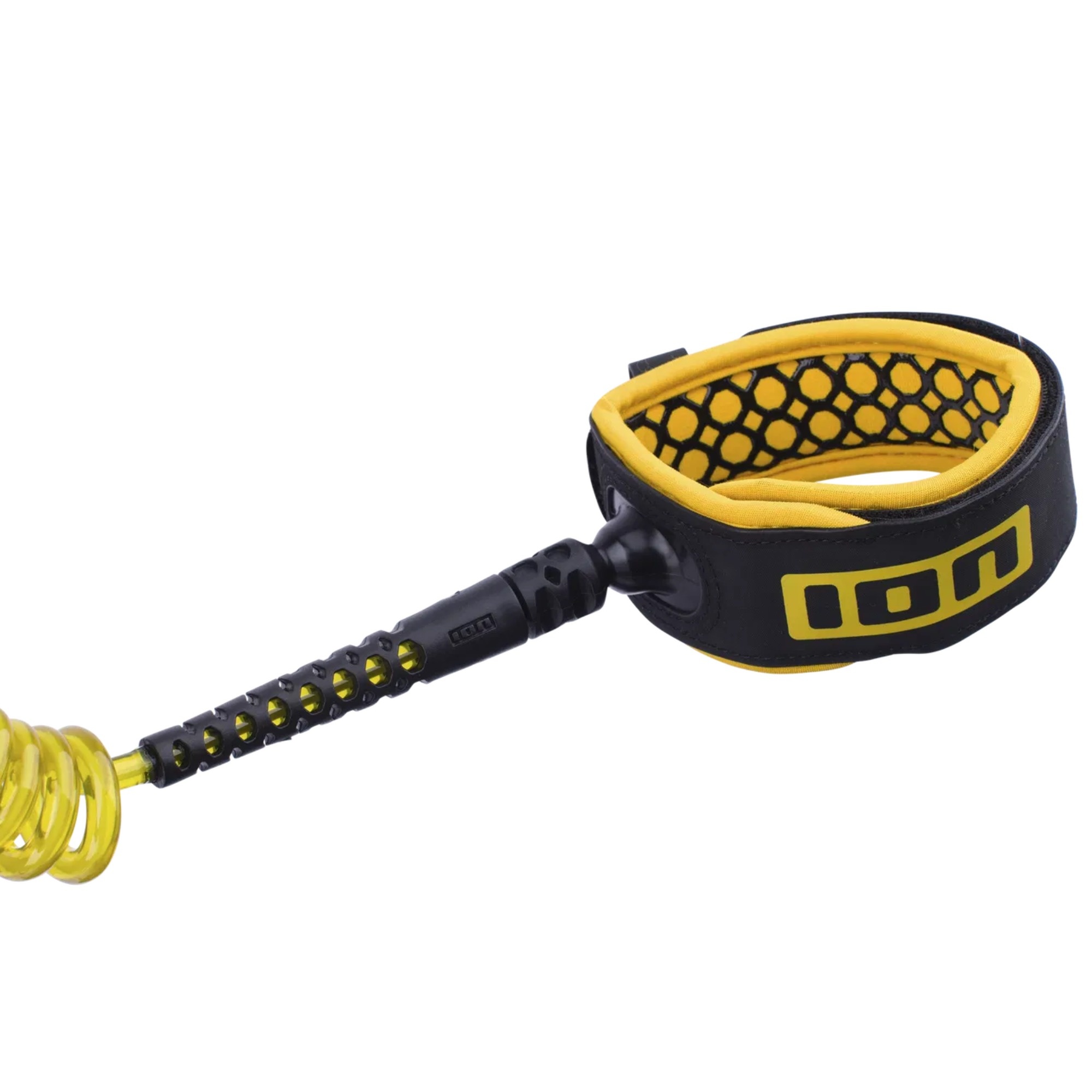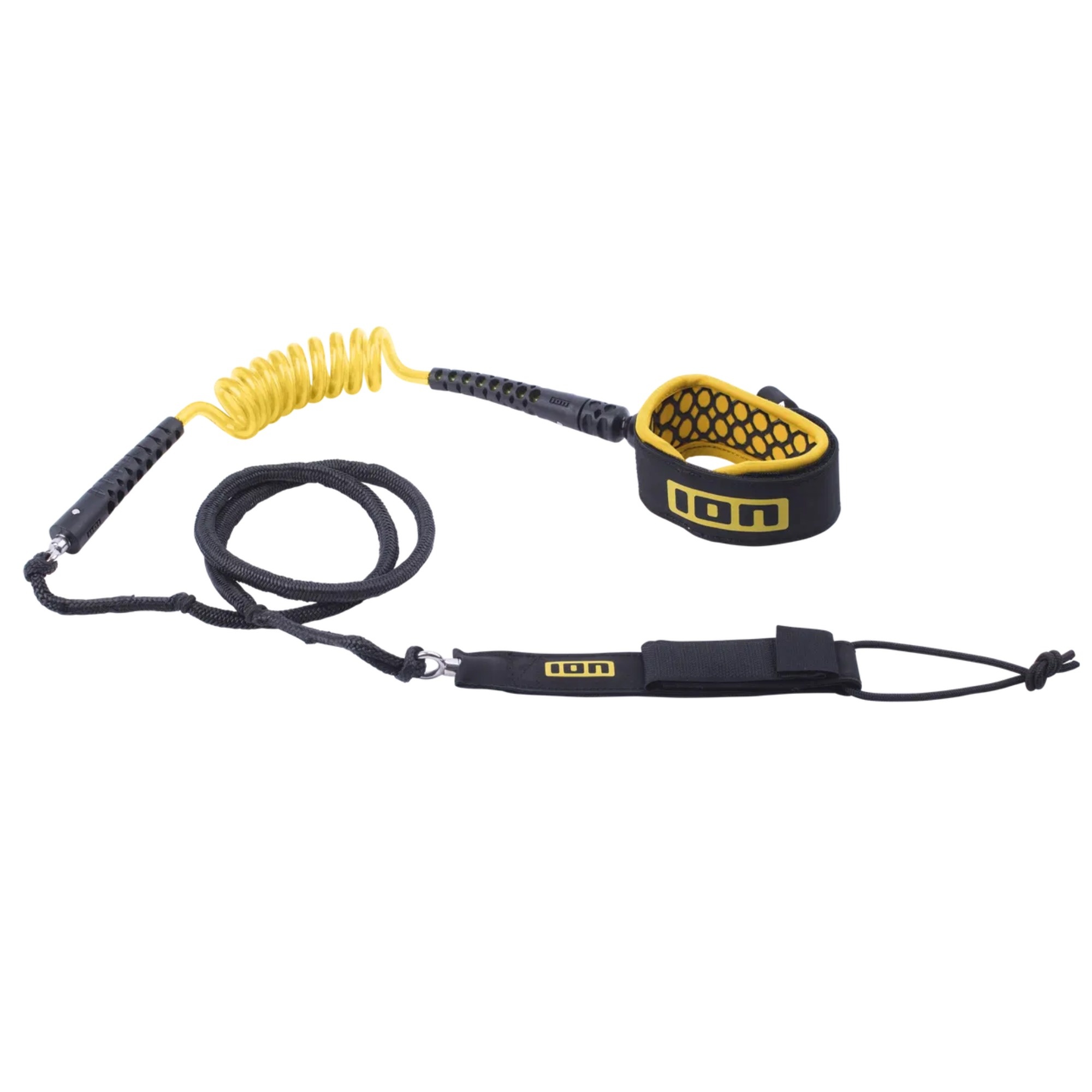 ION Wing Board Leash Core Hybrid Ankle is a leash for wingfoiling with a hybrid concept: compact and less prone to tangling in normal riding, with extra leeway when the board pulls away after a crash. It combines a 7 mm coiled urethane cord with a 6 mm woven Dyneema cord for strength. A thin neoprene cuff with honeycomb silicone print and a Hyplaon exterior keeps the fit secure, while swivels help reduce twisting.