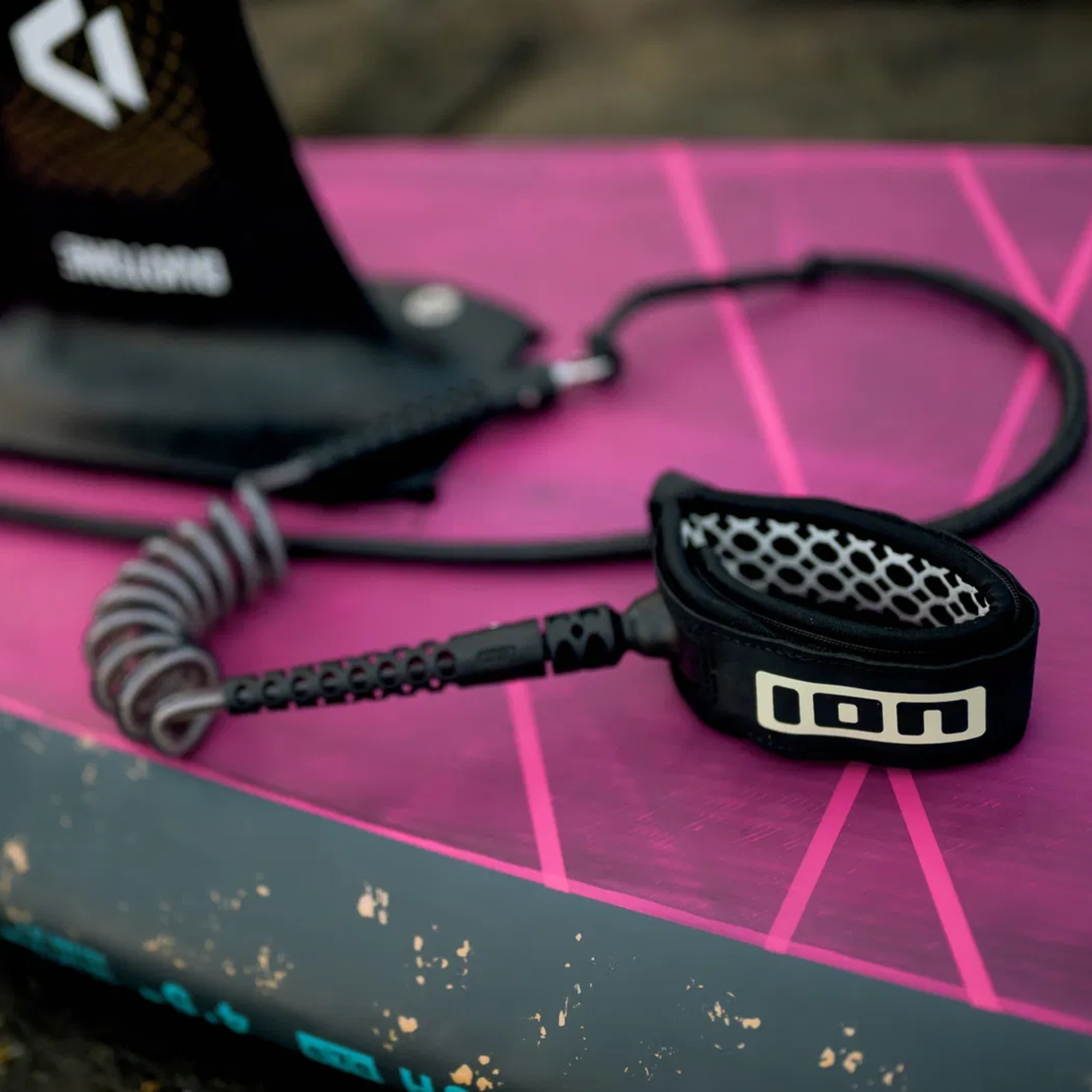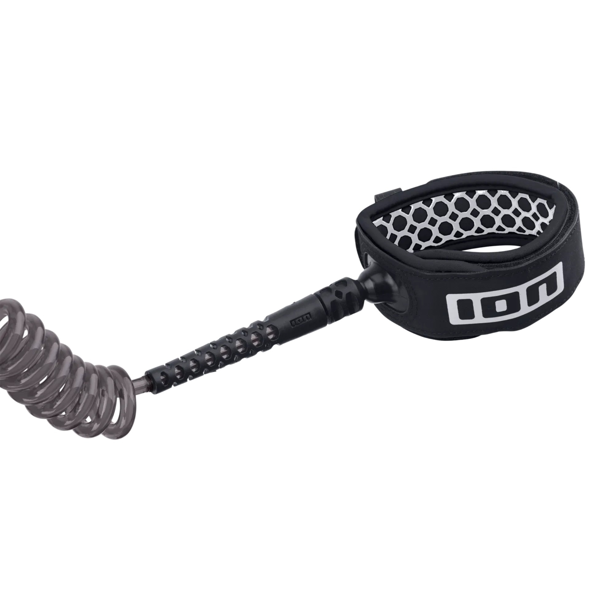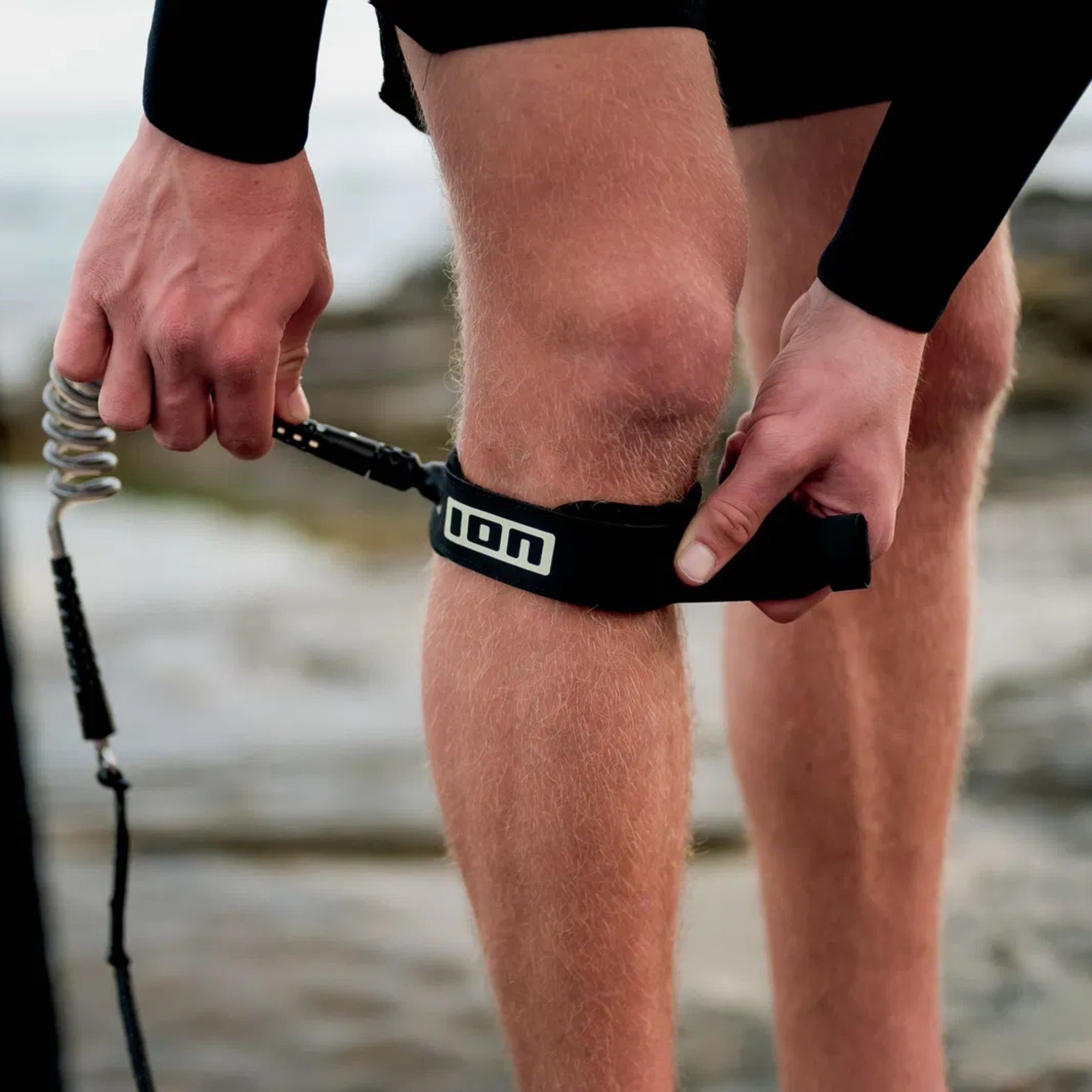 ION Wing Board Leash Core Hybrid Knee is a wingfoiling worn below the knee, using a hybrid concept: compact and less prone to tangling while riding, with extra leeway when the board pulls away after a crash. It combines a 7 mm coiled urethane cord with a 6 mm Dyneema reinforcement.