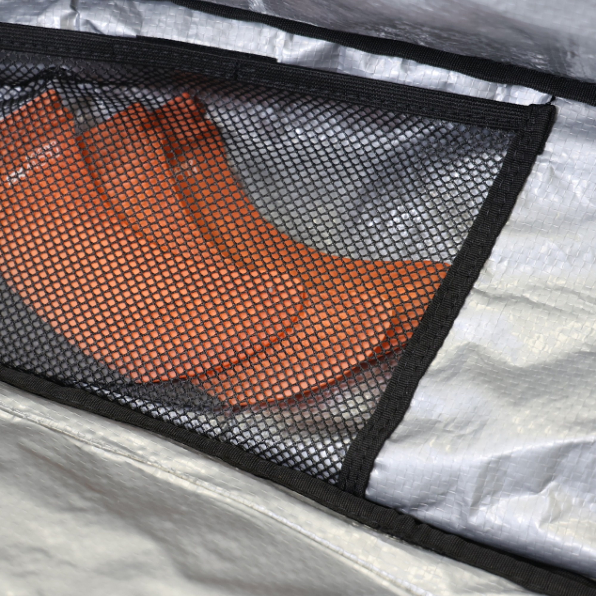 Inside the bag, multiple mesh pockets help organize accessories and small items. Side pockets are suitable for wax, fins and small hardware, while the top pocket can store a lycra, poncho or a small towel, which can also be used to protect the nose of the board.