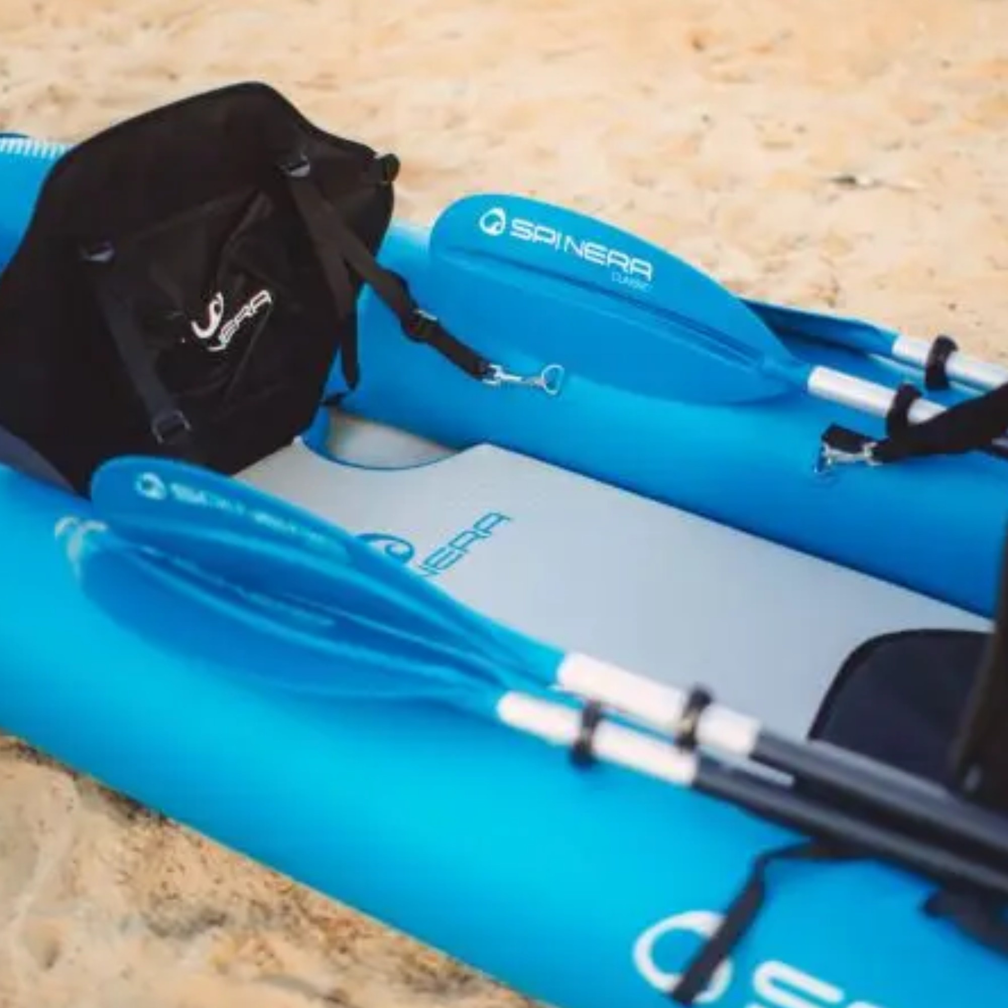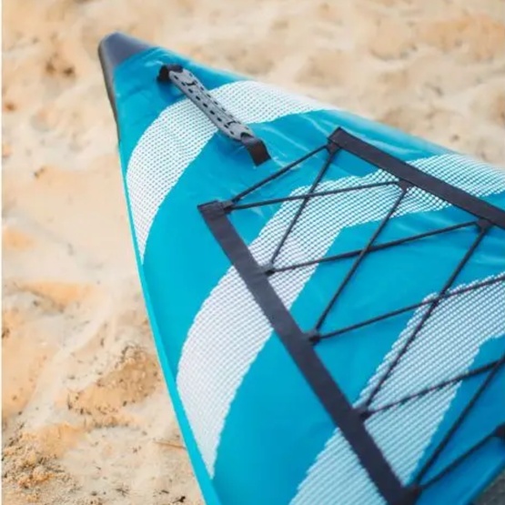 The construction features durable 0.8 mm reinforced PVC side tubes and a tarpaulin base reinforced with an 8 cm High Density Drop Stitch (HDDS) floor. This combination provides stiffness and stability similar to that of a hard-shell kayak, ensuring a solid and secure feel on the water.