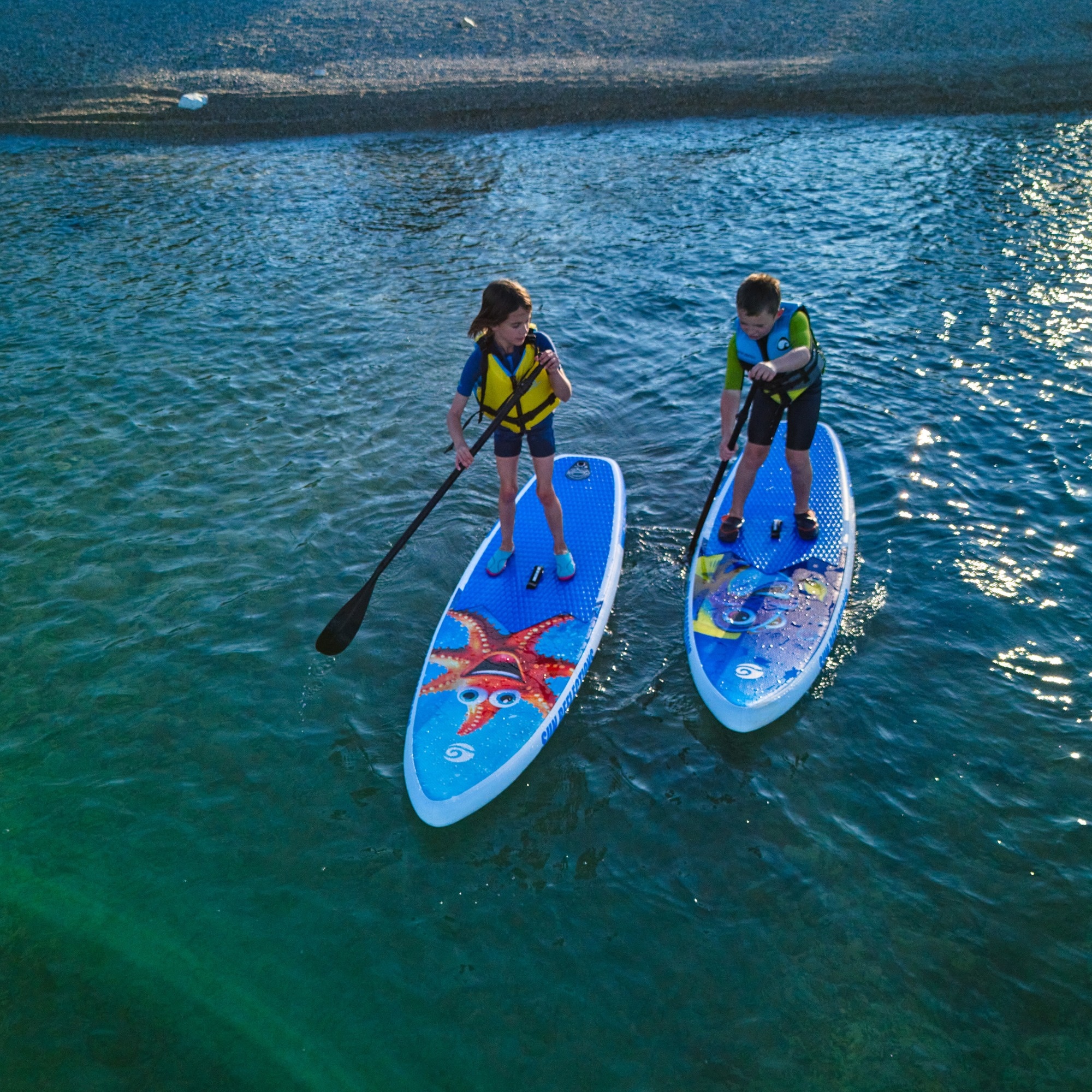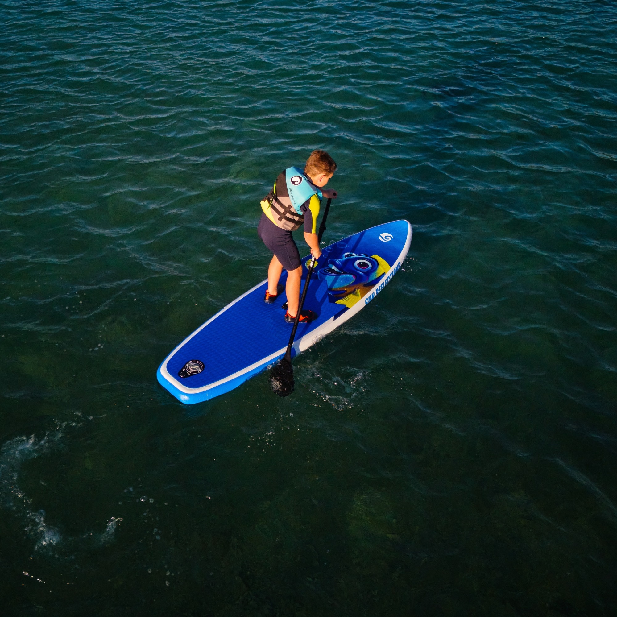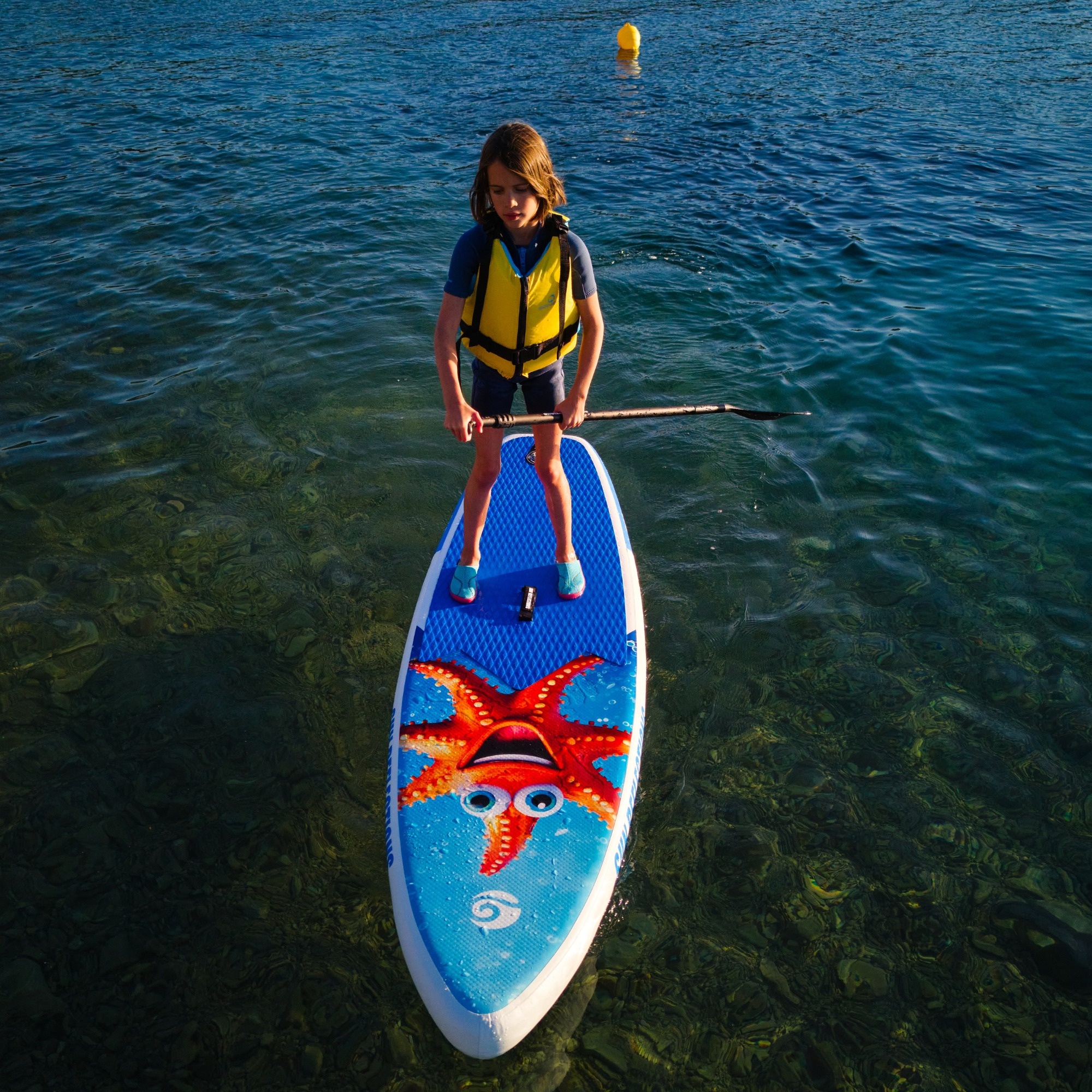 The Star SUN REFLECTIONS 8'2’’ SUP board was designed with young beginners in mind – children who are just starting their stand-up paddleboarding adventure. Its compact size and low weight make it easy for kids to handle on the water, while the eye-catching graphics – featuring a starfish and a clownfish reminiscent of the character from the Nemo movie – make learning more fun and engaging.