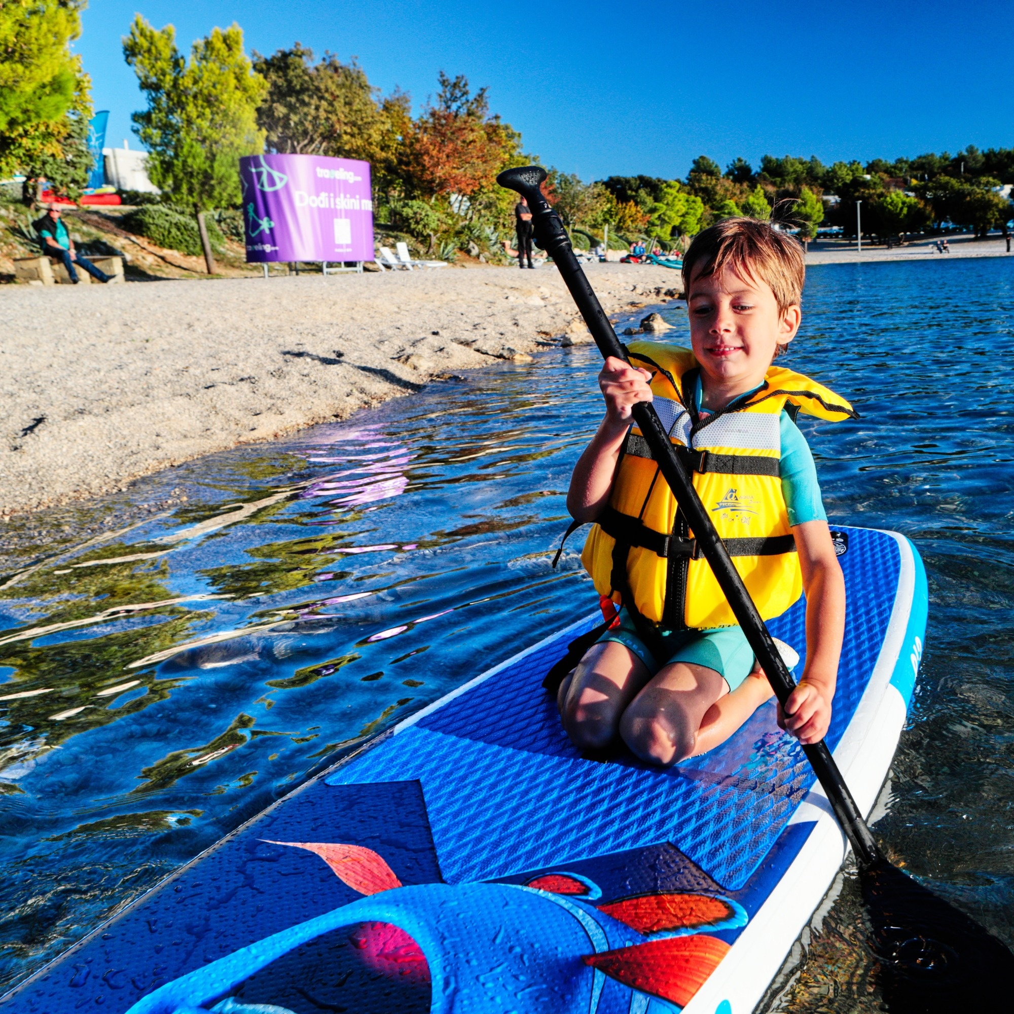 With a volume of 145 liters and a weight capacity of up to 60 kg, the board is well-suited for school-age children. The deck is covered with a soft, non-slip EVA pad that enhances safety and comfort, even during longer sessions. A removable fin helps maintain a straight line and improves control – especially useful for beginners. A neoprene handle in the center of the board allows your child to carry it more easily.