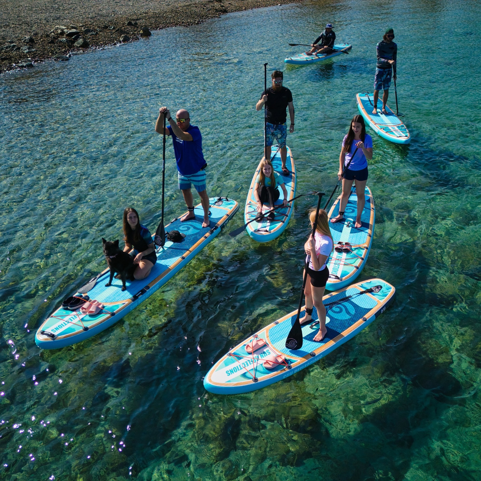 The deck is covered with an anti-slip EVA pad that enhances grip and comfort. A front bungee cord system allows you to secure light gear. The set also includes a 10-liter waterproof dry bag for safely storing essentials such as your phone or keys.